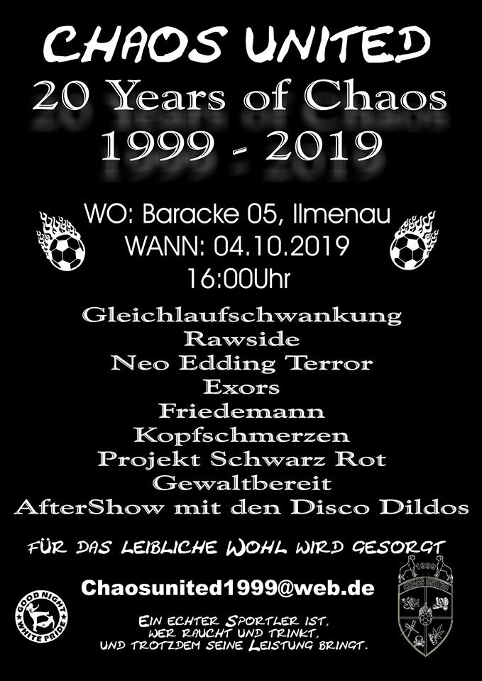 in diesem Jahr wird unser Chaotischer Haufen 20 Jahre alt. Im Prinzip schon 21 Jahre vorher gab es die berühmtberüchtigten Schwarzmützen bis der eigentliche Name Chaos United enstanden ist. In diesem Jahr wollen wir mit einem ganz besonderem Line Up das ganze gebührend feiern. Wir freuen uns auf euch am 04.10. in den heiligen Hallen der Baracke 5 in Ilmenau.