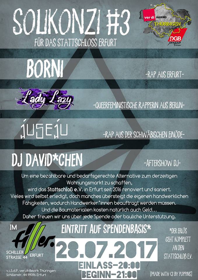 Der Eintritt basiert auf Spendenbasis, bedeutet, jeder gibt einfach so viel wie er mag und kann. Der Erlös geht komplett an den Stattschloß e. V. für die Renovierung und Sanierung der Räumlichkeiten. Genauere Infos zum Stattschloß findet ihr oben auf dem Flyer und auch am Konzi-Abend.