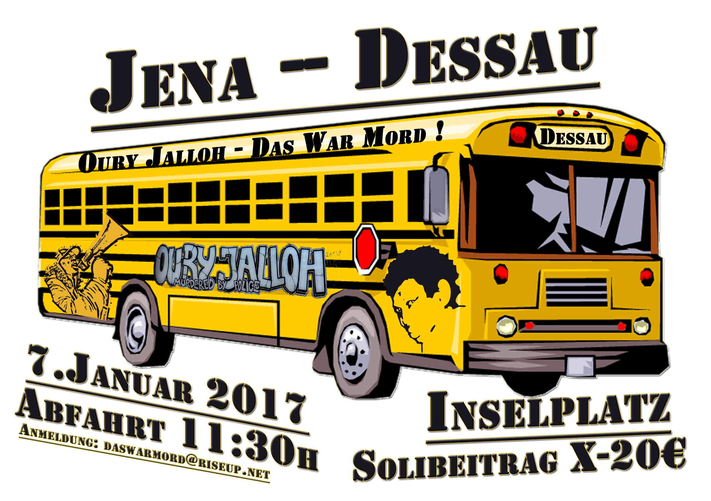 Für den Bus zur Oury-Jalloh-Gedenkdemo in Dessau am 7.1.2017 (https://initiativeouryjalloh.wordpress.com/) gibt es bisher eindeutig zu wenige Anmeldungen. Wenn binnen der nächsten zwei Tage nicht mehr hinzukommen, wird es keinen Bus geben.