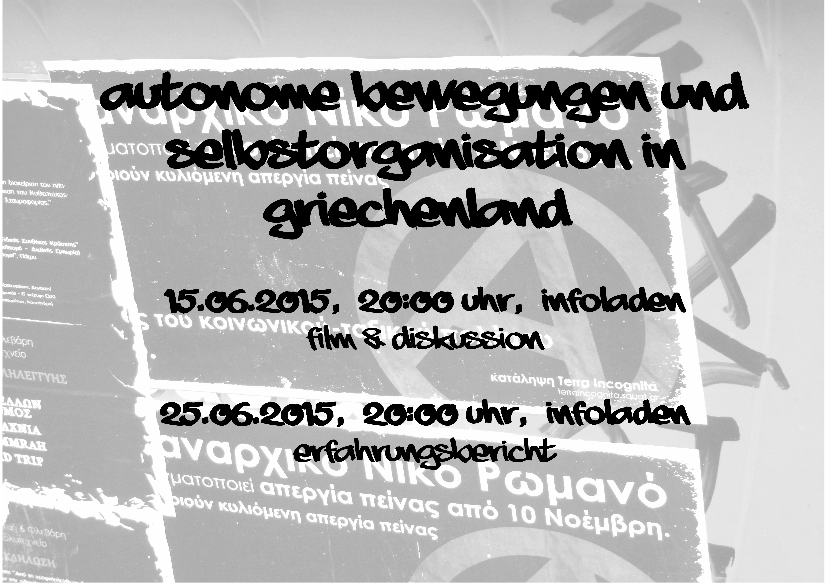 15.06.2015, 20:00 Uhr, Infoladen FILMPRÄSENTATION UND DISKUSSION ZUM THEMA SELBSTORGANISATION IN GRIECHENLAND: LET’S NOT LIVE LIKE SLAVES, 2013 (90 min) (deutsche Untertitel) Neben Impressionen aus den größten Städten Griechenlands — Thessaloniki und Athen, kommen u.a. Aktivist_innen aus Hausprojekten, Stadtteilgärten, selbstverwalteten Fabriken und Kliniken, migrantischen Initiativen, dem antifaschistischen Selbstschutz zu Wort. Gezeigt wird, dass es die griechische außerparlamentarische Linke, trotz oder gerade wegen der Krise verstanden hat sich Räume anzueignen und damit handlungsfähig zu bleiben. Durch den Film soll ein Eindruck über die gesellschaftliche Situation in Folge der Krise in Griechenland vermittelt werden. Im Anschluss an den Film laden wir euch zu einer offenen Diskussion ein.