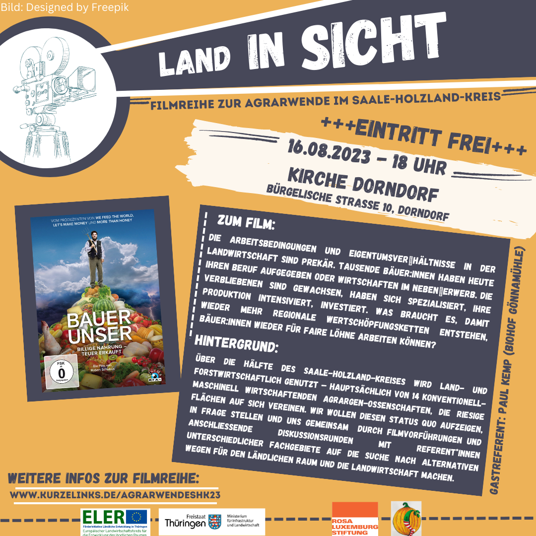 Über die Hälfte des Saale-Holzland-Kreises wird land‑, forst- und ernährungswirtschaftlich genutzt – überwiegend von 14 Agrargenossenschaften, die jeweils relativ viel Fläche auf sich vereinen und diese konventionell-maschinell bewirtschaften. Kleine Inseln darin, „die etwas anders machen“ – gibt es schon – aber bisher nur vereinzelt. Wir wollen diesen Status Quo aufzeigen, in Frage stellen und uns gemeinsam mit Interessierten durch Filmvorführung und im Anschluss stattfindenden Diskussionen mit ReferentInnen unterschiedlicher Fachgebiete auf die Suche nach alternativen Wegen für den ländlichen Raum und die Landwirtschaft machen.