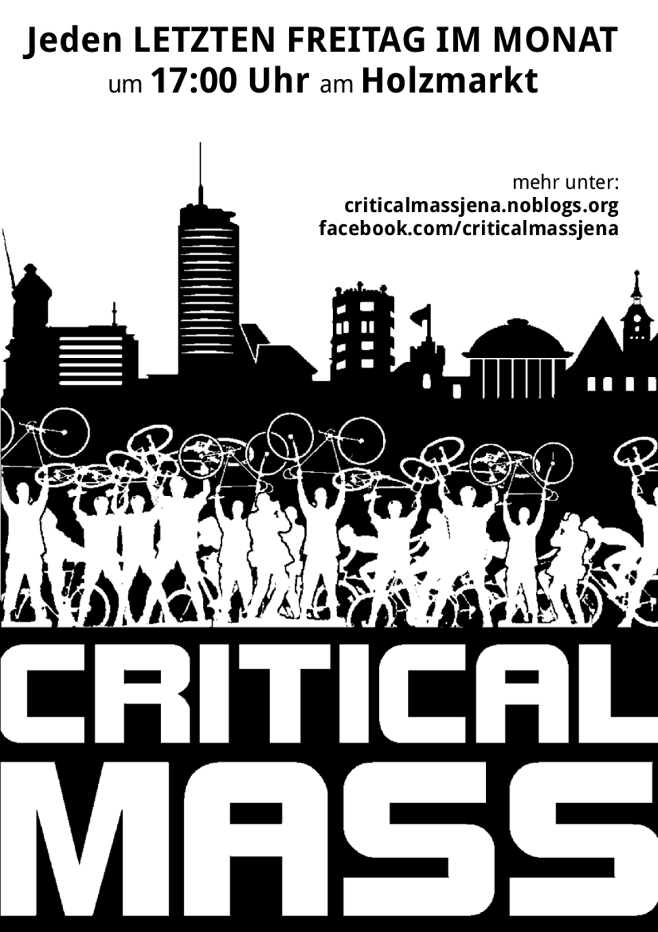 In vielen Städten Europas hat sich die Critical Mass für den letzten Freitag im Monat etabliert. Nun wollen wir es auch in Jena angehen. Schnappt euer Rad und kommt vorbei!