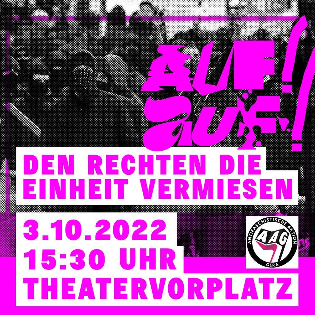 Nach­dem nun schon seit Monat­en die Strassen unser­er Stadt für Hass und recht­sex­treme Het­ze miss­braucht wer­den, wollen wir den Recht­en am 03.10.2022 die Ein­heit ver­miesen und das gründlich.