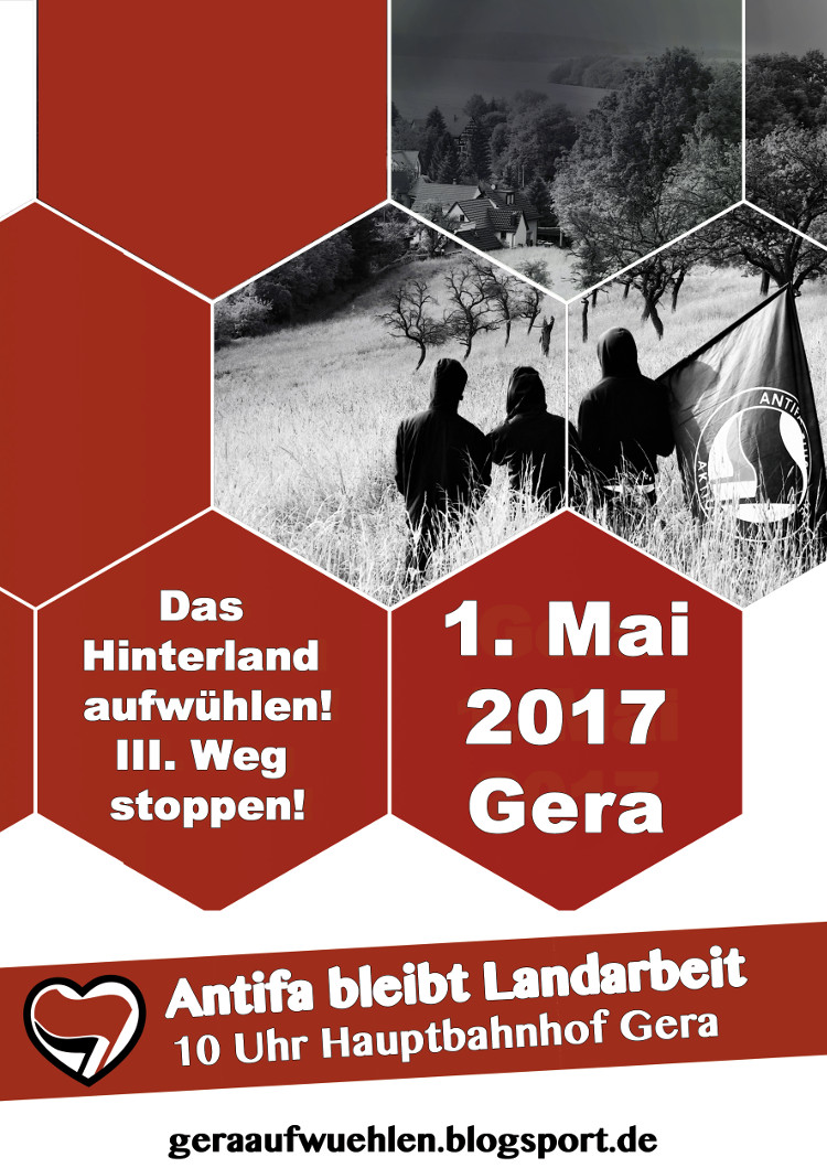 Am 1. Mai will in Gera der ras­sis­tisch-nation­al­is­tis­che Mob der als Partei getarn­ten Organ­i­sa­tion Der III. Weg um das ehe­ma­lige Freie Netz Süd auf­marschieren. Die Partei Der III. Weg fol­gt rhetorisch, inhaltlich und in ihren Aktio­nen der Agi­ta­tion „Freier Kam­er­ad­schaften“ und gibt sich antikap­i­tal­is­tisch. Die Losung „Kap­i­tal­is­mus zer­schla­gen – für Fam­i­lie, Heimat, Tra­di­tion“ im Aufruf macht dabei deren völkischen, antifem­i­nis­tis­chen und reak­tionären Charak­ter mehr als deut­lich.