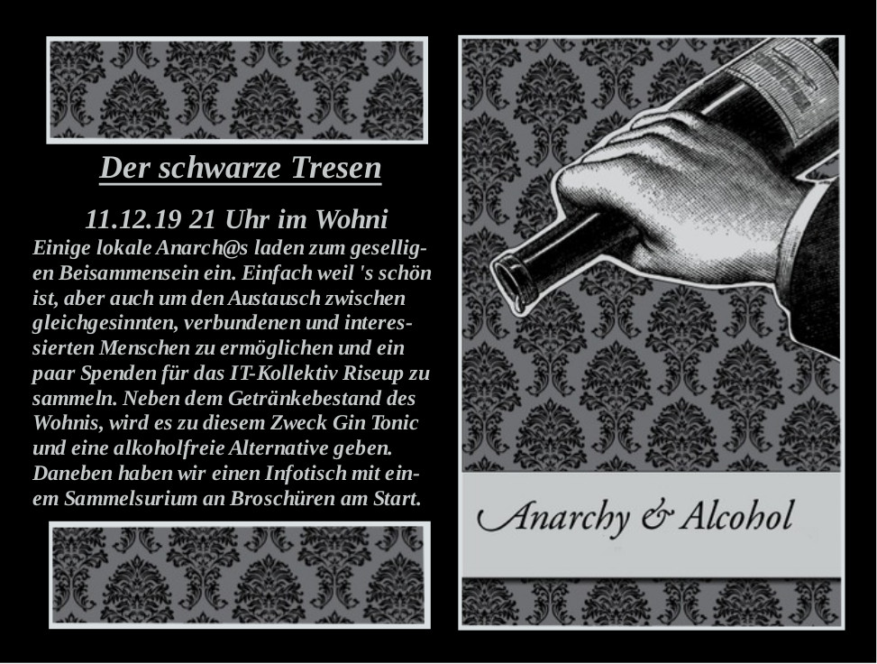 Einige lokale Anarch@s laden zum geselligen Beisammensein ein. Einfach, weil’s schön ist, aber auch um den Austausch zwischen gleichgesinnten, verbundenen und interessierten Menschen zu ermöglichen und ein paar Spenden für das IT-Kollektiv Riseup zu sammeln. Neben dem Getränkebestand des Wohnis wird es zu diesem Zweck Gin Tonic und eine alkoholfreie Alternative geben. Daneben haben wir einen Infotisch mit einem Sammelsurium an Broschüren am Start.