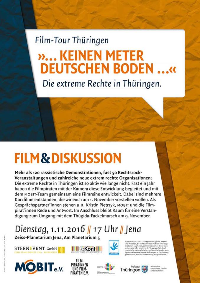 Die stark zunehmenden neonazistischen Aktivitäten in Thüringen des letzten Jahres sind auch in Jena deutlich spürbar geworden. Aufgrund der aktuellen Ankündigung einer erneuten Demonstration von Thügida am 09.11. im Damenviertel, laden in einer Kooperationsveranstaltung Kokont , MOBIT, das Referat Menschenrechte des Studierendenrates der FSU Jena und das Zeiss – Planetarium zu einer Infoveranstaltung ein.