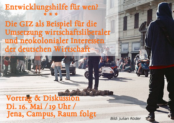 Die seit 2010 privatwirtschaftlich agierende “Deutsche Gesellschaft für Internationale Zusammenarbeit (GIZ) GmbH” ist der weltweit größte Dienstleister im entwicklungspolitischen Bereich, sie untersteht den Zielen der Bundesrepublik Deutschland. Neben den über 16.000 Beschäftigten, sind indirekt viele junge Menschen mit dem weltwärts Programm für die GIZ auf Informationsbeschaffung. Für viele Studierende ist die GIZ ein seriöser Arbeitgeber. Warum die Tätigkeit bei der GIZ fragwürdig ist soll in dem Vortrag gezeigt werden.
