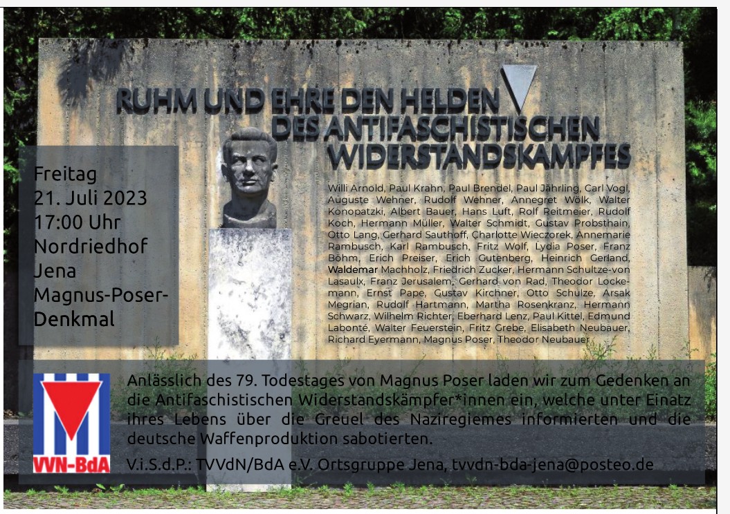 Anlässlich des 79. Todestages von Magnus Poser laden wir zum Gedenken an die antifaschistischen Widerstandskämpfer:innen ein, welche unter Einsatz ihres Lebens über die Gräuel des Naziregimes informierten und die deutsche Waffenproduktion sabotierten: