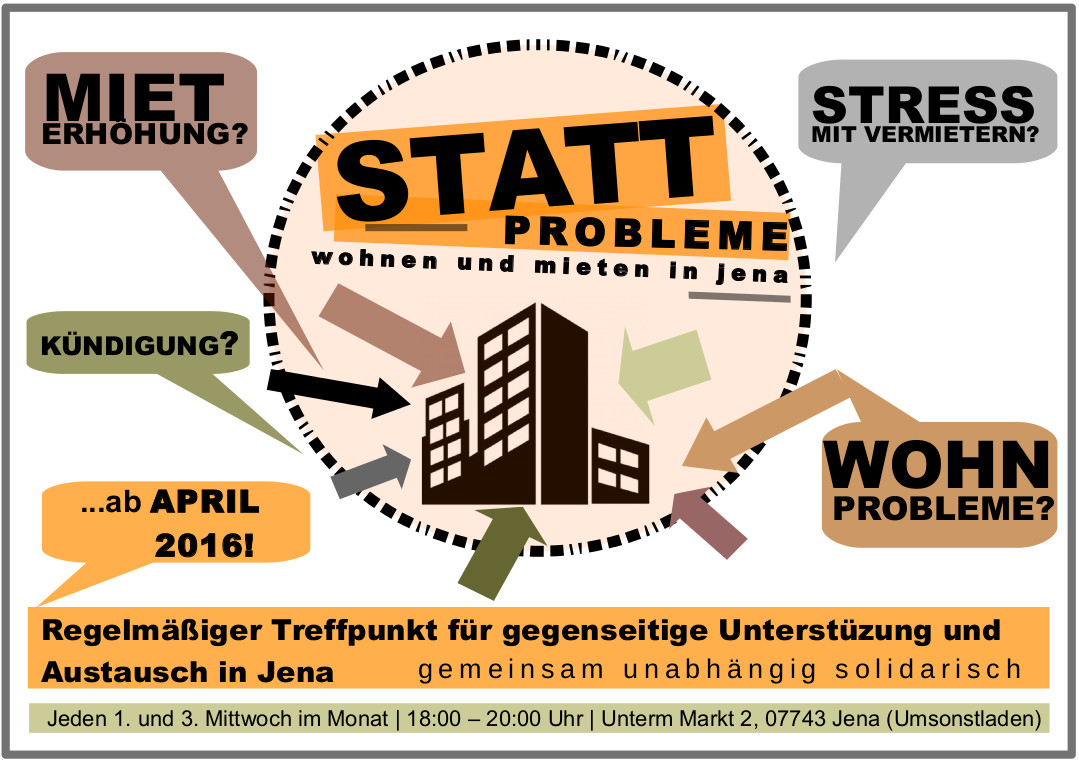 Mit dem Gespräch­skreis “STATT-Prob­leme” möchte wir von nun an einen regelmäßi­gen Tre­ff­punkt für Aus­tausch und gegen­seit­ige Unter­stützung bei Woh­nung­sprob­le­men in Jena schaf­fen. Der Woh­nungskrise und dem per­man­ten Anstieg der Mieten hier in der Stadt, kön­nen wir nur gemein­sam und sol­i­darisch etwas ent­ge­genset­zen. Wir Mieter_innen der Stadt müssen uns endlich zusam­men­tun und für das ein­treten, was uns allen bedin­gungs­los zuste­hen sollte: Bezahlbares und würdi­ges Wohnen und unser kollek­tives “Recht auf Stadt”!