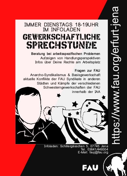Die FAU Erfurt/Jena bietet jeden Dien­stag von 18 – 19 Uhr eine gew­erkschaftliche Sprech­stunde an. Idee dahin­ter ist es euch bei euren arbeitsspez­i­fis­chen Prob­le­men zu berat­en, sprich euch mit Infor­ma­tio­nen über den rechtlichen Rah­men zu ver­sor­gen und gemein­sam indi­vidu­elle wie auch kollek­tive Hand­lungsper­spek­tiv­en zu entwick­eln. Natür­lich seid ihr eben­so willkom­men falls ihr Fra­gen zur FAU und dahin­ter­ste­hen­den Konzept des Anar­cho-Syn­dikalis­mus oder der Basis­gew­erkschaft habt. Darüber hin­aus kön­nen wir euch auch mit Infor­ma­tio­nen zu den aktuellen Kon­flik­ten der FAU Syn­dikate in anderen Städten oder den Kämpfen der ver­schiede­nen Schwest­erngew­erkschaften der FAUin­ner­halb der IAA ver­sor­gen. Find­en kön­nt ihr uns im Info­laden Jena (Schil­lergäßchen 5, 07743 Jena) oder tele­fonisch erre­ichen unter 03641/449304. Falls der Ter­min für euch ungün­stig ist schreibt uns ein­fach eine Mail: fauj@fau.org