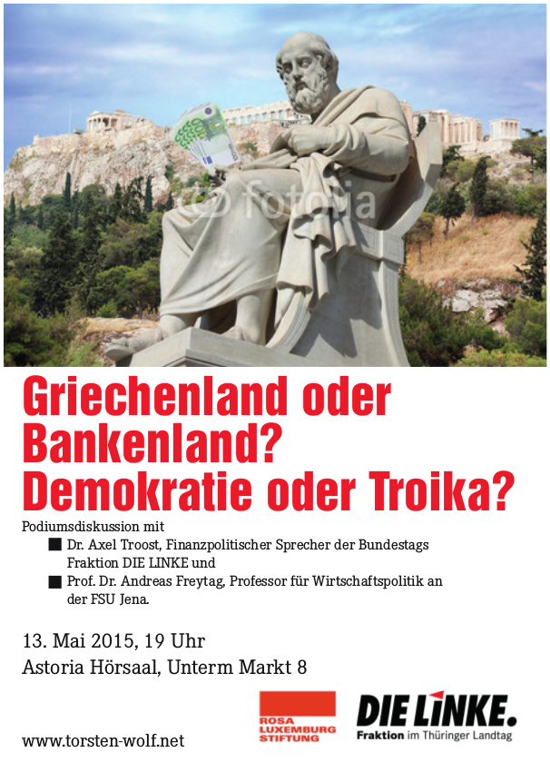 Über die Politik der Europäischen Zentralbank gegenüber der neuen griechischen Regierung, die Szenarien für die Entwicklung der sogenannten Eurozone und die zukünftige wirtschaftliche und soziale Entwicklung in Griechenland diskutieren der finanzpolitische Sprecher der Fraktion Die LINKE im Deutschen Bundestag, Dr. Axel Troost, und Prof. Dr. Andreas Freytag, Inhaber des Lehrstuhl für Wirtschaftspolitik an der Friedrich-Schiller-Universität Jena.