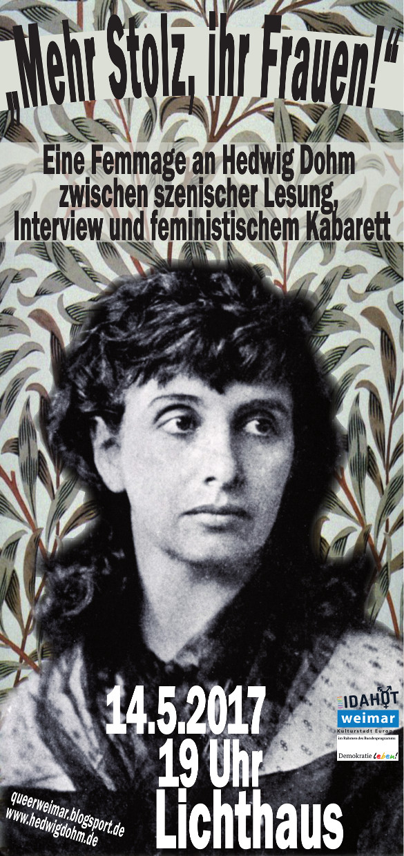 Hedwig Dohm (1831–1919) war DIE Pionierin der Frauenbewegung in Deutschland und eine wunderbar witzige und innovative Autorin. Bis heute haben ihre Texte, in denen sie die völlige rechtliche, soziale und ökonomische Gleichberechtigung von Frauen und Männern fordert, nichts von ihrer Frische und Aktualität verloren. Dohms Markenzeichen ist ihre Ironie. Mit bekannten Zeitgenossen von Friedrich Nietzsche bis Georg Groddeck liefert sie sich in ihren Texten wahre Wortgefechte – wie gemacht für die Bühne und für das „Dohm-Trio“ Nikola Müller, Isabel Rohner und Gerd Buurmann. Spannend, informativ und dabei höchst unterhaltsam stellen die beiden Herausgeberinnen der Edition Hedwig Dohm zusammen mit Schauspieler Gerd Buurmann Dohms Leben und Werk vor.