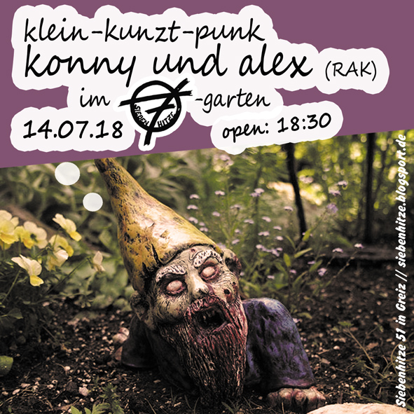 Konny und Alex beschallen seit Jahren die Straßen und Bühnen mit Gitarre, Quetsche, Kontrabass. Beide kommen aus der RAK und die Menschen, die wissen was das ist, können sich vorstellen was sie erwartet. Fetter Kleinkunztpunk mit rotzfrecher Straßenromantik. Das ganze dann mal sarkastisch, mal voll auf die Fresse präsentiert schwanken die Songs zwischen politischem Protest und solidarischem gemeinsamen Abschalten.