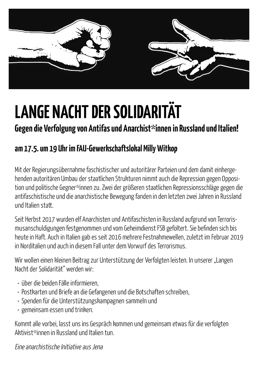 Seit Herbst 2017 wurden elf Anarchisten und Antifaschisten in Russland aufgrund von Terrorismusanschuldigungen festgenommen und vom Geheimdienst FSB gefoltert. Sie befinden sich bis heute in Haft. Auch in Italien gab es seit 2016 mehrere Festnahmewellen, zuletzt im Februar 2019 in Norditalien und auch in diesem Fall unter dem Vorwurf des Terrorismus.