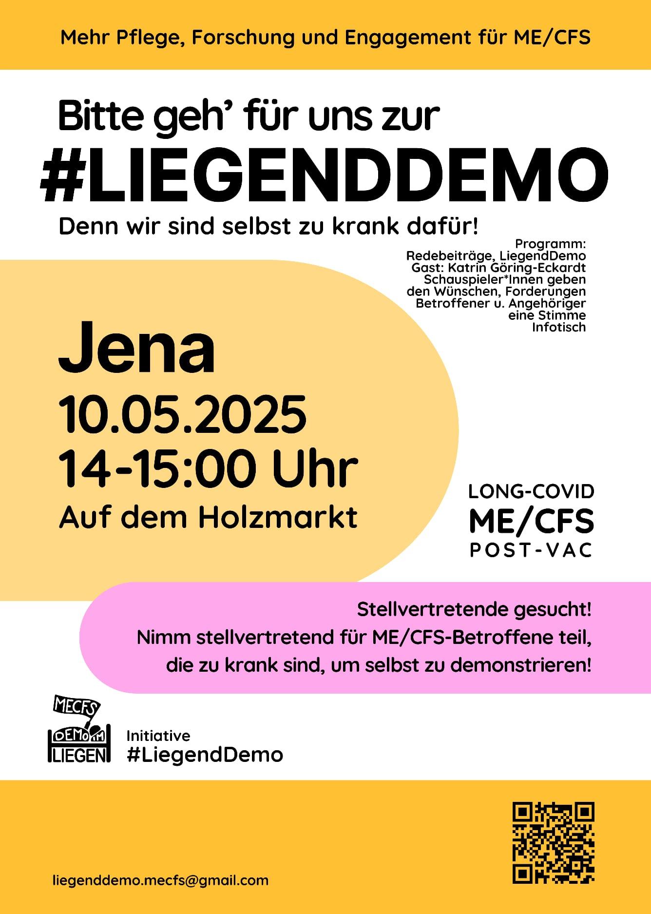 wir vom ME/CFS-Netzwerk Thüringen organisieren anlässlich der ME-Awarenesstage eine LiegendDemo, um für Forschung, Anerkennung und Versorgung für ME/CFS zu kämpfen (mehr Hintergründe unter https://mecfs-thueringen.de/informationen-ueber-me-cfs/). Weil von ME/CFS betroffene Menschen aus dem öffentlichen Leben oft verschwinden, wollen wir mit der LiegendDemo für mehr Aufmerksamkeit sorgen und – im Liegen – für unsere Rechte demonstrieren. Dazu wollen wir Euch und Sie alle einladen, ob als Mitbetroffene oder Angehörige, Unterstützende, Gruppen, Vereine, Verbände oder einzelne Interessierte.