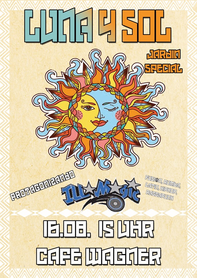 Am Freitag den 16. August möchten wir in unserem Garten unser Café mit euch lieben Gästen gebührend in die vierwöchige Sommerpause verabschieden. Was bietet sich dafür besser an als ein entspannter Nachmittag, verträumter Sonnenuntergang und lebhafter Tanz zum Start in die Nacht? Genau dafür geht unser mediterranes Träumchen “Luna Y Sol” vom dunklen Nachtclub hinaus in die Sonne und Illmagic hat neben seinem Mix aus Mestizo, Fusión, Rumba, Latin, HipHop, Folk und Raggapunk gemeinsam mit der Wagner Crew auch kulinarisch leckere Specials für einen lauschigen Sommerabend am Start.