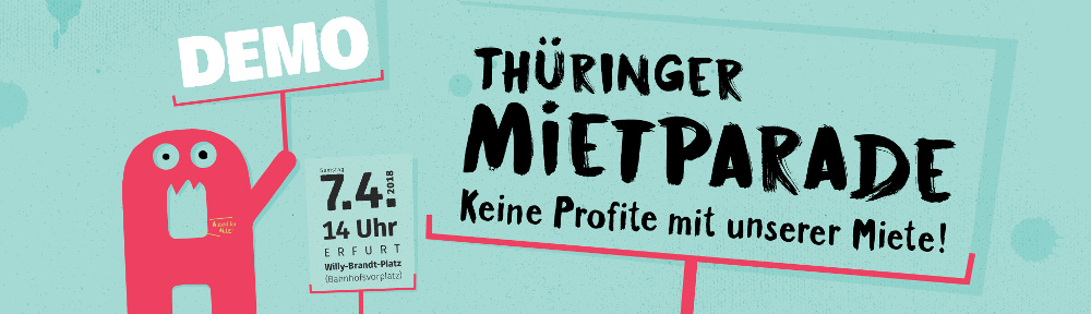 Zuziehende haben Probleme, überhaupt eine Bleibe zu finden. In Erfurt, Jena und Weimar mangelt es massiv an leistbarem Wohnraum für Menschen mit geringem Einkommen, für Geflüchtete, für Alleinerziehende, für Alte, … Schuld daran ist der Immobilienmarkt, welcher der kapitalistischen Logik der Profitmaximierung folgt. Und eine Politik, welche die Liberalisierung des Wohnungsmarktes und die Privatisierung von Wohnraum vorantreibt. Gemeinsam verwandeln sie die Stadt in eine soziale Gefahrenzone, in der vielen Menschen die Verdrängung droht. Doch unser Zuhause ist kein Anlageobjekt, die Thüringer Städtekette kein Diamantencollier. Deshalb werden wir uns am 7. April 2018 mit der 1. Mietparade die Stadt zurücknehmen.
