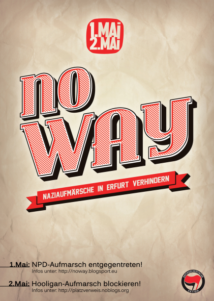 Am 1. Mai 2015 will die Thüringer NPD erneut in Erfurt aufmarschieren. Die Nazi-Partei will gegen die rot-rot-grüne Landesregierung, „die etablierte Politik“ im Allgemeinen und Flüchtlinge demonstrieren. Rassistisch fordert die Partei, es gehe ihr ausschließlich um „soziale Gerechtigkeit für alle Deutschen statt einer untergerechten Almosenpolitik für alle Fremden“.