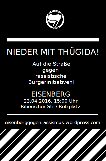 Am 23.04. wollen die Nazis von Thügi­da / “Wir lieben den Saale-Hol­z­land-Kreis” wieder in Eisen­berg marschieren. Tre­f­fen wollen sie sich ab 16:00 Uhr im Verkehrs­garten. Es häufen sich ihre Besuche in Eisen­berg, zulet­zt sind sie im Dezem­ber mit Fack­eln durch die Kreis­stadt gezo­gen. Unseren Rede­beitrag dazu kön­nt ihr hier nach­le­sen.
