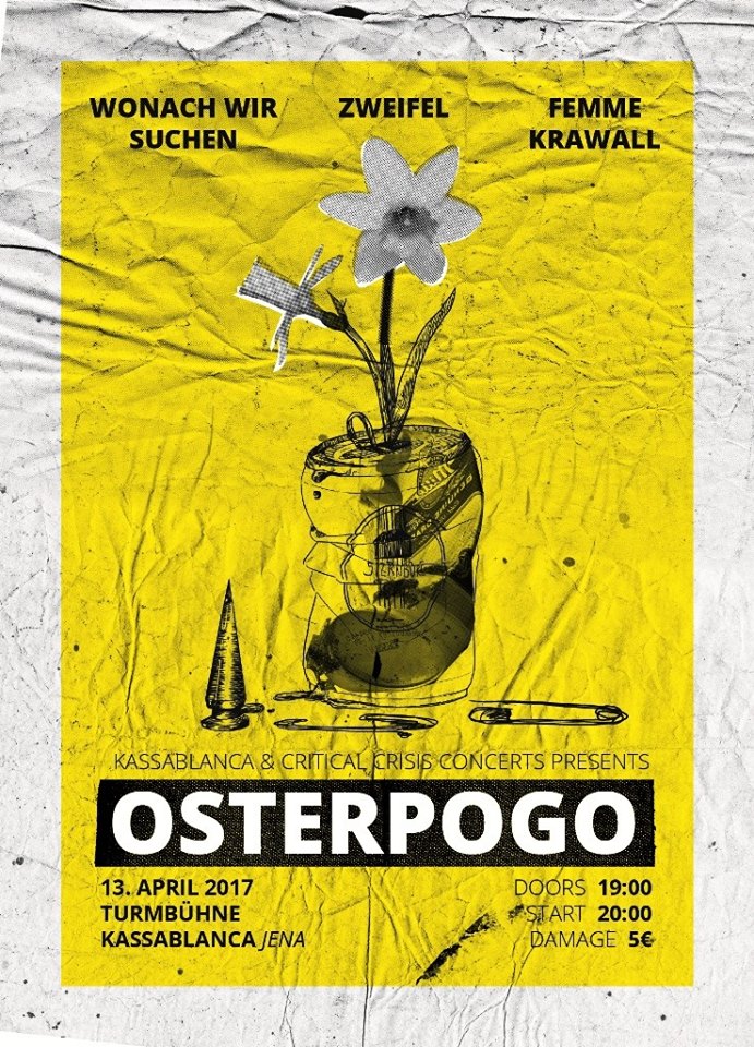 CCC goes Kas­sa!! Im Geiste des Punkrock­kaf­fees geht’s auf die Turm­bühne. Und zwar gle­ich mit dem Ver­such eine neue Rei­he zu etablieren. Endlich habt ihr einen guten Grund, warum ihr ver­spätet bei den famil­iären Oster­feier­lichkeit­en aufkreuzt. Ihr habt euch näm­lich am Grün­don­ner­stag beim Oster­pogo mas­siv gegön­nt!