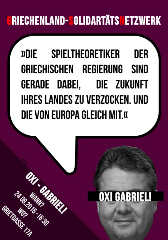 Nachdem die Mehrheit der Menschen in Griechenland beim Referendum „OXI“ – also „Nein“ – zur erpresserischen Verhandlungsstrategie nicht demokratisch legitimierter Institutionen, OXI zu einer Sparpolitik, die Sozialsicherungssysteme zerstört und OXI zu Privatisierungen und sozialer Spaltung gesagt hat, wollen wir uns in Jena diesem NEIN anschließen. Die deutsche Bundesregierung war als Hardliner führend daran beteiligt, die brutale, wirtschaftlich desaströse Sparpolitik und einen massiven Demokratieabbau in Griechenland zu erzwingen. Sigmar Gabriel – Vorsitzender der SPD, Vizekanzler und Energie- und Wirtschaftsminister – hat diesen Kurs nicht nur mitgetragen, sondern sich mehrfach als rechtspopulistischer Scharfmacher und Verhandlungsblockierer betätigt. Unmittelbar nach dem Referendum hat er verkündet, Griechenland habe die letzten Brücken für einen Kompromiss mit ‚Europa‘ eingerissen. Tatsächlich gab es am Ende keinen Kompromiss. Die deutsche Regierung und ihre Partner haben ein Ergebnis erpresst, in dem Griechenland stellvertretend für alle sozialen und demokratischen Alternativen zur neoliberalen Sparpolitik abgestraft wurde. Hannah Eberle, eine Sprecherin von Blockupy, hält zurecht fest: „überall kommt allen ehrlichen Sozialdemokratinnen und Sozialdemokraten bei Gabriels Politik das Grausen.“