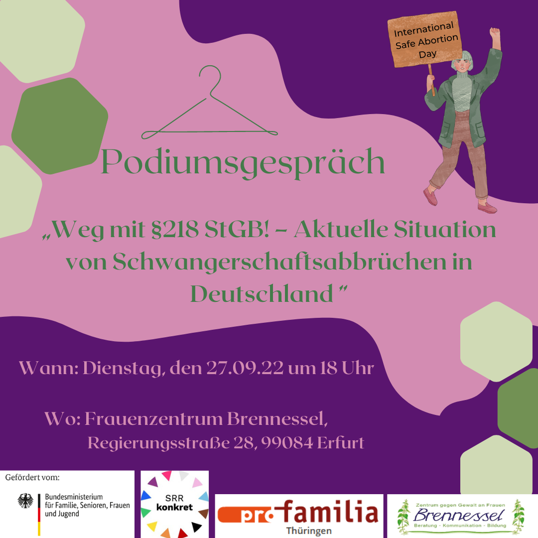 Auf dem Podium sind verschiedene Stimmen vertreten. Eine Person berichtet von eigenen Erfahrungen mit dem Prozess eines Schwangerschaftsabbruches. Weitere Podiumsteilnehmende nehmen die politische, die beraterische und die LSBT*IQ+ Perspektive ein. Das Podiumsgespräch wird von Karin Kretschmer (Projektkoordinatorin Sexuelle und reproduktive Rechte KONKRET, pro familia Landesverband Thüringen e.V.) moderiert.