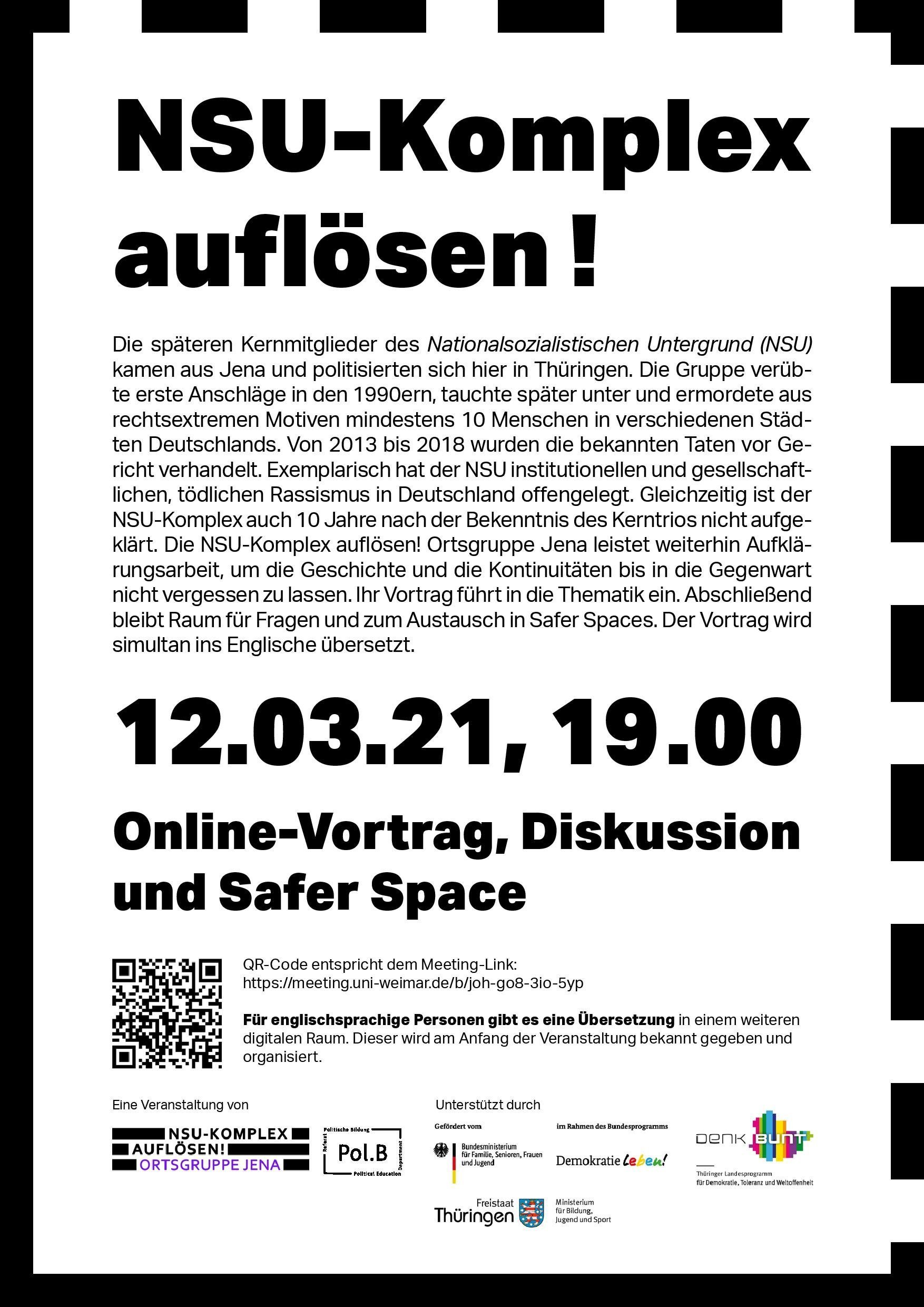 Die späteren Kernmitglieder des Nationalsozialistischen Untergrund (NSU) kamen aus Jena und politisierten sich hier in Thüringen. Die Gruppe verübte erste Anschläge in den 1990ern, tauchte später unter und ermordete aus rechtsextremen Motiven mindestens 10 Menschen in verschiedenen Städten Deutschlands. Von 2013 bis 2018 wurden die bekannten Taten vor Gericht verhandelt. Exemplarisch hat der NSU institutionellen und gesellschaft-lichen, tödlichen Rassismus in Deutschland offengelegt. Gleichzeitig ist der NSU-Komplex auch 10 Jahre nach der Bekenntnis des Kerntrios nicht aufgeklärt. Die NSU-Komplex auflösen! Ortsgruppe Jena leistet weiterhin Aufklärungsarbeit, um die Geschichte und die Kontinuitäten bis in die Gegenwart nicht vergessen zu lassen. Ihr Vortrag führt in die Thematik ein. Abschließend bleibt Raum für Fragen und zum Austausch in Safer Spaces. Der Vortrag wird simultan ins Englische übersetzt.