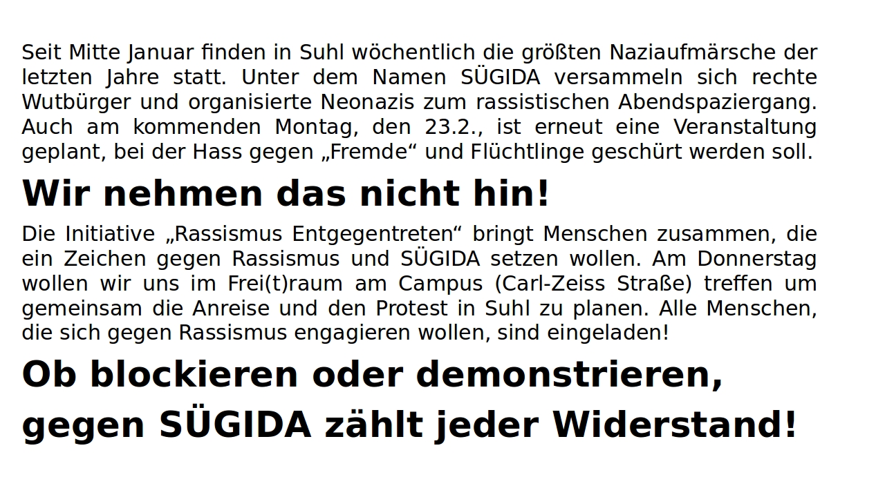 « Alle Veranstaltungen Rassismus entgegentreten — Demovorbereitung 19. Februar 2015 | 18:00 Rassismus entgegentreten — Demovorbereitung Am Montag, 23.02., wollen wir wieder gemeinsam nach Suhl um dem rassistischen Normalzustand der Gesellschaft und Sügida entgegenzutreten. Dafür wollen wir uns organisieren. Datum: 19. Februar 2015 Zeit: 18:00 Veranstaltungskategorie/n: Infoveranstaltungen, Filme & Workshops Veranstaltungsort: Frei(t)raum Campus, Uni Jena Veranstalter*in: Veranstaltungslink: Nächste »
