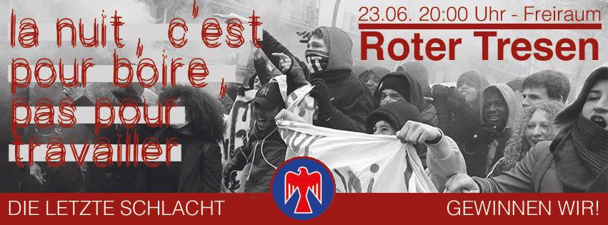 Die Falken Jena laden am Donnerstag, den 23. Juni, ab 20 Uhr in den Freiraum zum zweiten Roten Tresen. So schön es auch ist, euch ein weiteres Mal zu diesem Happening einladen zu können, so traurig sind wir, dass dies wohl der (diesmal wirklich!) letzte Solitresen an diesem Ort sein wird. Ein Grund mehr, in bierseeliger Runde, unterstützt von einer kreativen Auswahl eigens gebrauter Leckereien, der Tristess des Alltags entgegenzuraunen: Die letzte Schlacht gewinnen wir!