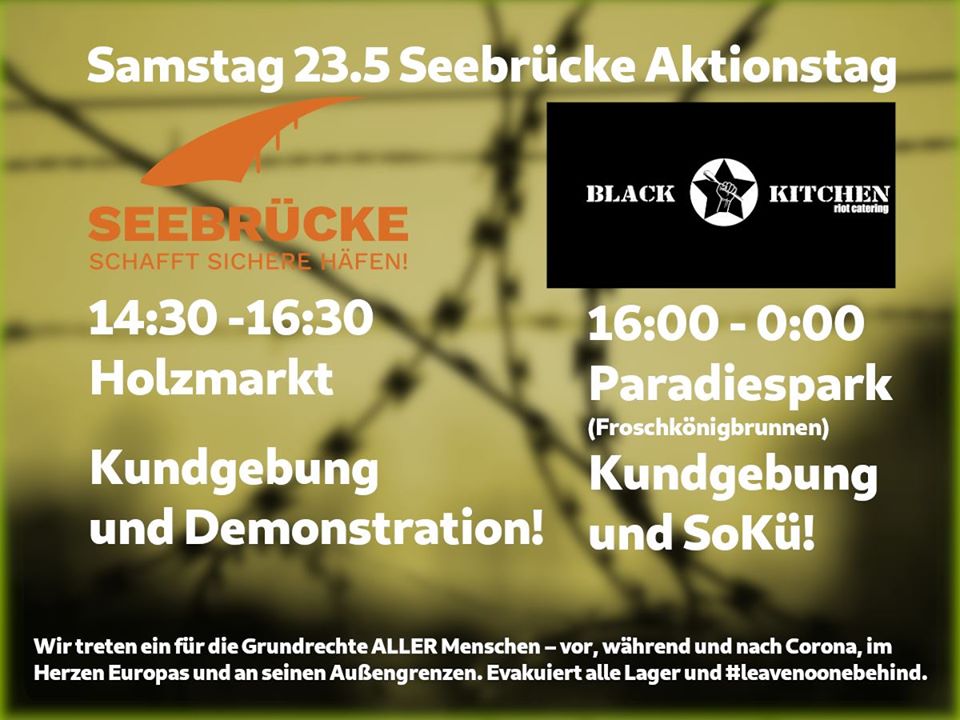 Zum Aktionstag der Seebrücke am 23.5 ab 16:00 veranstalten wir eine Kundgebung unter dem Titel: “NoBorderKitchen – Evakuiert ALLE Lager – Leave no one behind” im Paradiespark beim Froschkönigbrunnen mit Sokü aus der Gulaschkanone.