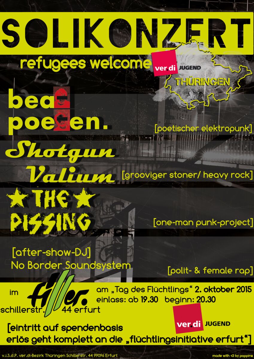 Am Tag des Flüchtlings hat die ver.di Jugend ein Solikonzert organisiert. Der Eintritt ist auf Spendenbasis und alle Einnahmen werden an die “Flüchtlingsinitiative Erfurt” gespendet.
