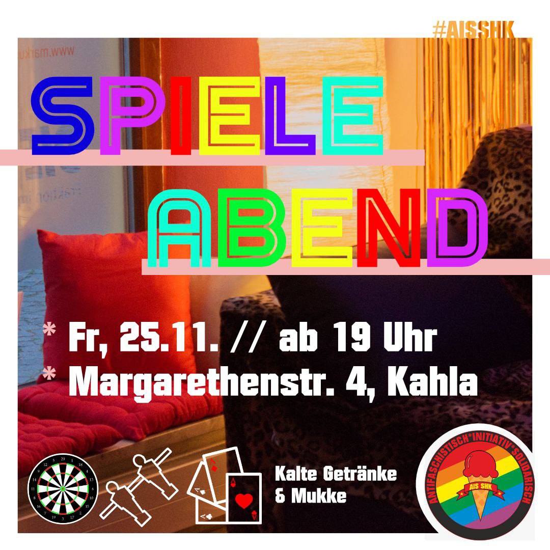 her­zliche Ein­ladung zum gemütlichen Spiele- und Barabend am Fr. 25.11. ab 19 Uhr in Kahla!