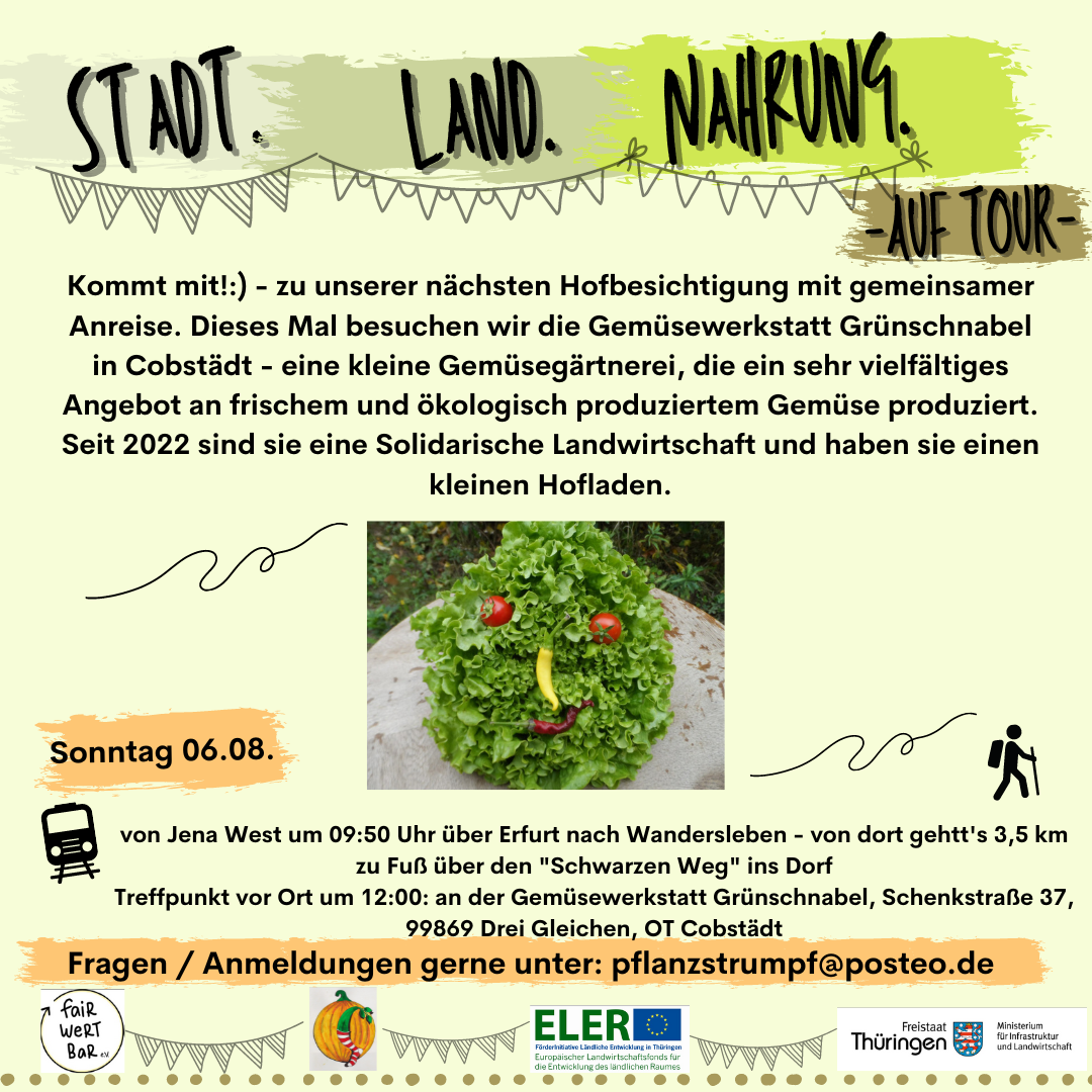 Kommt mit!:) — zu unserer nächsten Hofbesichtigung mit gemeinsamer Anreise. Dieses Mal besuchen wir die Gemüsewerkstatt Grünschnabel in Cobstädt — eine kleine Gemüsegärtnerei, die ein sehr vielfältiges Angebot an frischem und ökologisch produziertem Gemüse produziert. Seit 2022 sind sie eine Solidarische Landwirtschaft und haben sie einen kleinen Hofladen.