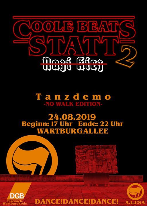 Um der Tristesse in der Prov­inz ent­ge­gen­zuwirken, um alter­na­tive Men­schen vor gewalt­täti­gen Neon­azis zu schützen, und um ger­ade jun­gen Men­schen eine Per­spek­tive zu bieten, benötigt Eise­nach ein “AZ”. Wir wer­den weit­er­hin dafür kämpfen und haben uns deshalb entschlossen, am 24.08.2019 eine Tanzkundge­bung am “Arbei­t­er­denkmal” in der Wart­bur­gallee durchzuführen. Wir wollen an diesem Tag ein­mal mehr den öffentlichen Raum nutzen, um unsere Forderun­gen auf die Straße zu tra­gen.