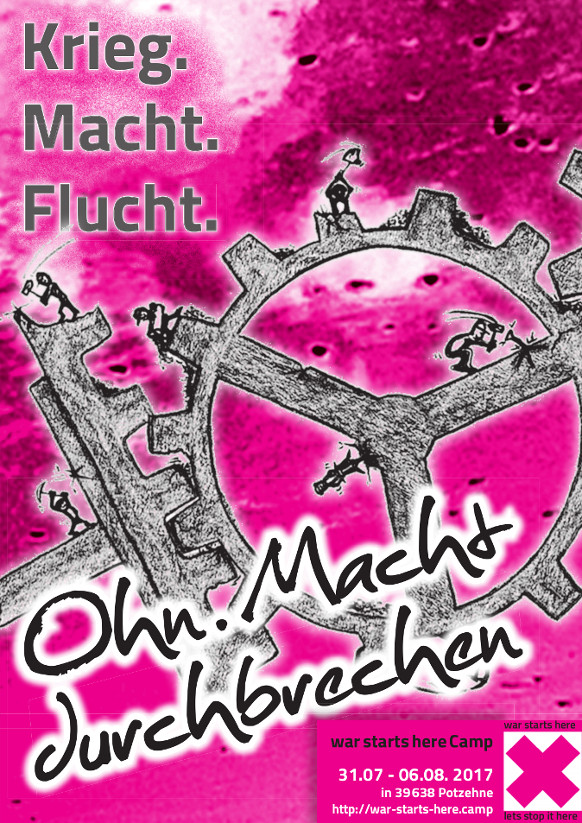 Bei diesem (inzwischen sechsten) Camp knüpfen wir am Thema des letzten Camps an. „Krieg.Macht.Flucht.“ ist immer noch aktuell. Diesmal geht es vor allem darum, antimilitaristische und antirassistische Perspektiven zu entwickeln. Lasst uns unsere OhnMacht gemeinsam durchbrechen! Das Camp in Potzehne wird ein Ort dafür sein. Wir wollen eine Diskussion auf Augenhöhe mit allen, die das Gleiche antreibt: die Abneigung gegen die zerstörerischen Verhältnisse weltweit.