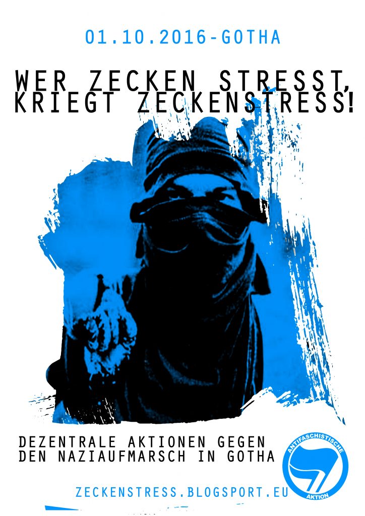 Am 01.10.2016 wollen die friedensbesehlten Nazis rund um das BZLG (Bündnis Zukunft Landkreis Gotha) eine Demonstration unter dem Motto „Gegen linke Gewalt“ zelebrieren. Beginnen soll diese um 14:00 Uhr auf dem Bahnhofsvorplatz in Gotha. Anlass für die Nazis stellen wohl, neben den vermeintlich unzählbar vielen „linken Gewalttaten“ in Gotha, vor allem die Geschehnisse vom 8. September dar. Hier ein kurzer Rückblick: klick. Auch bundesweit bekannte Naziaktivisten, wie der „Die Rechte“ Abgeordnete Alexander Kurth aus Leipzig, wollen an der Demonstration teilnehmen.Was die Nazis genau planen ist nicht bekannt, lediglich dass sie eine Demo ab dem Gothaer Hauptbahnhof angemeldet haben und diese bewerben. Wahrscheinlich ist damit zu rechnen, dass sie versuchen werden in die Nähe der Räume des Ju.w.e.l. e.V. in der Hersdorfstraße zu kommen. Für sie sind diese Räume das Herz der antifaschistischen Bestie. In den vergangenen Jahren wurde immer wieder versucht diese Räume anzugreifen. Dabei waren die nach Frieden plärrenden Nazis nicht zimperlich. Eine Kugelbombe wurde vor dem Haus deponiert und gezündet, zweimal griff eine Horde Hooligans an oder es flogen Steine durch die Fenster. Von den kleinen zahllosen Angriffen, wie das schmieren von Hakenkreuzen auf die Hauswand oder die abgetretenen Regenrohre, möchten wir gar nicht sprechen. Auch Demoanmelder Marco Zint wurde bereits beim Steineschmeissen auf die Räume gesehen. Um so mehr belächeln wir den Friedensaktivismus des BZLG. Wer einen Stein durch ein Fenster wirft, nimmt zumindest in Kauf das hinter dem Fenster jemand verletzt oder getötet wird. Wie sagte es Paul Spiegel so schön „Hinter den rufen nach Frieden verschanzen sich die Mörder.“. Augenscheinlich begeben sie sich, wie bei ihren Demos gegen den „aliierten Bombenterror“ oder der „Trauer um die gefallenen Kameraden des 2. Weltkrieges“, in die gewohnt weinerliche Opferrolle des gescheiterten und unfair geschlagenen Nationalsozialisten.